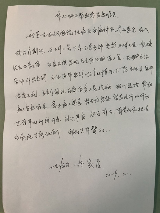 這一切都被一旁的方阿姨家人看在眼里,記在心里,不知道用什么方式去表達(dá)內(nèi)心的感激,于是親筆書寫了一封最樸實(shí)的表?yè)P(yáng)信送給血液內(nèi)科全體醫(yī)護(hù)人員。