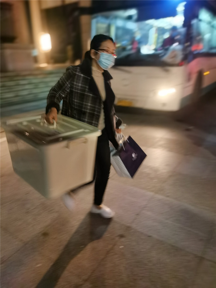 3月8日凌晨,抵達(dá)開化的第二天,由于臨時換車,她拎著一個大大的整理箱一路狂奔。