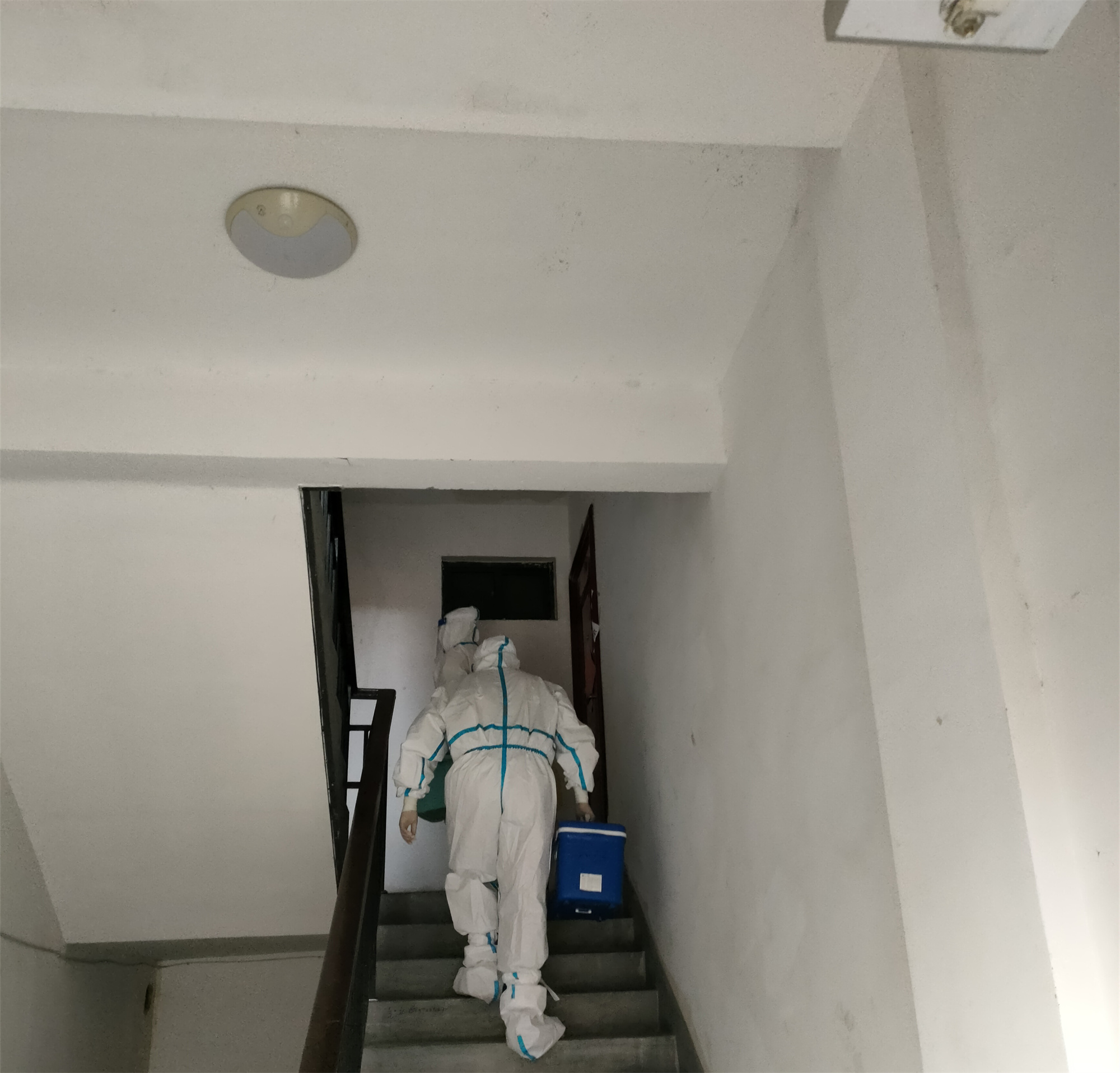 “我們組的任務(wù)是上門為年老體弱等不便下樓的人員上門采樣,市區(qū)的老小區(qū)沒有電梯,大多是老年人在此居住,我們要一遍又一遍的上樓、下樓。”昏暗的燈光下,窄窄的樓道里,周曉兵步伐堅定。
