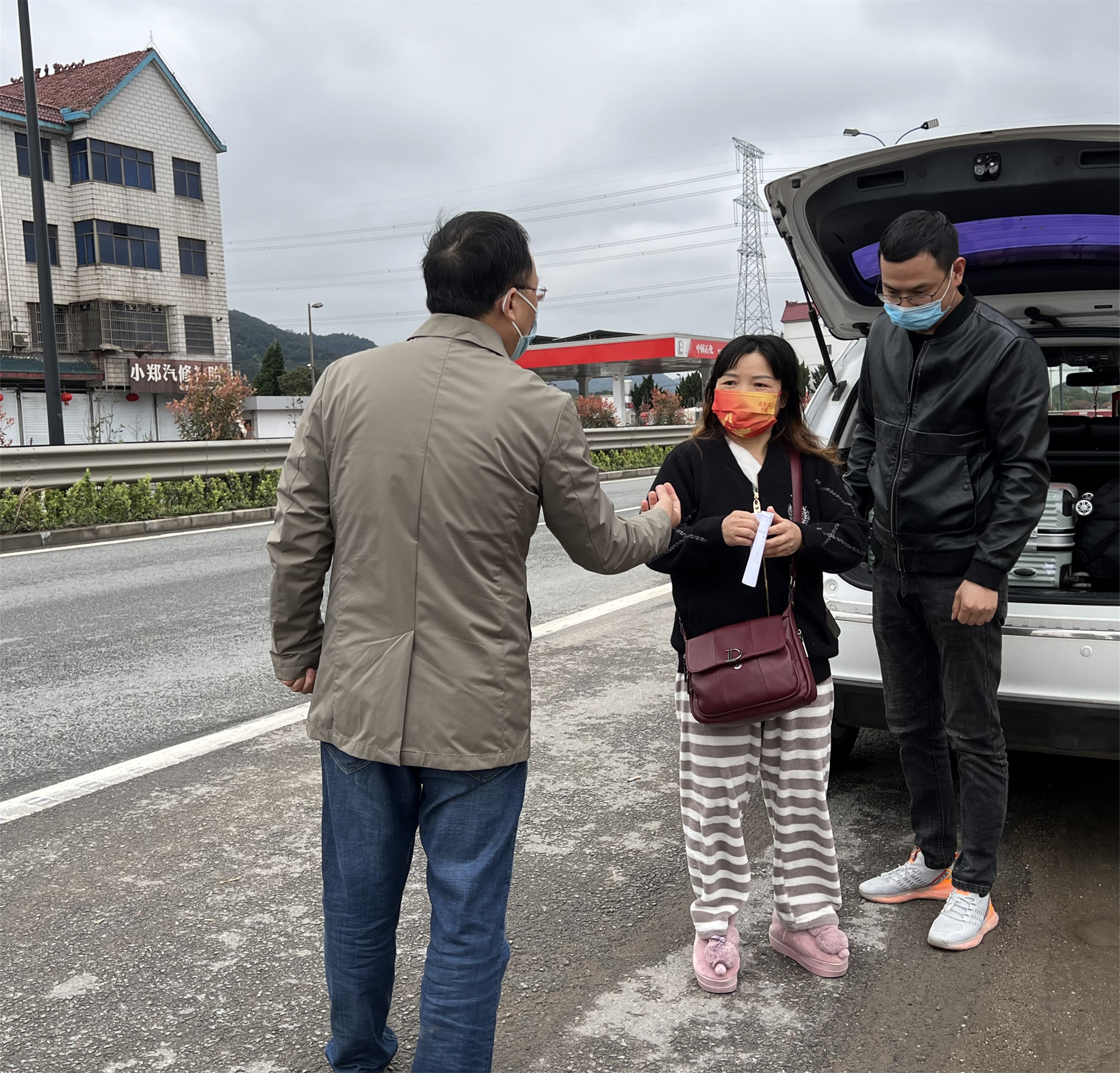 柯女士來(lái)自開(kāi)化縣桐村鎮(zhèn),一周前,因子宮肌瘤來(lái)到我院手術(shù)。由于交通管制,家人無(wú)法開(kāi)車直接到醫(yī)院來(lái)接她出院,得知柯女士情況后,婦科主任徐金貴承擔(dān)起了護(hù)送任務(wù)。
