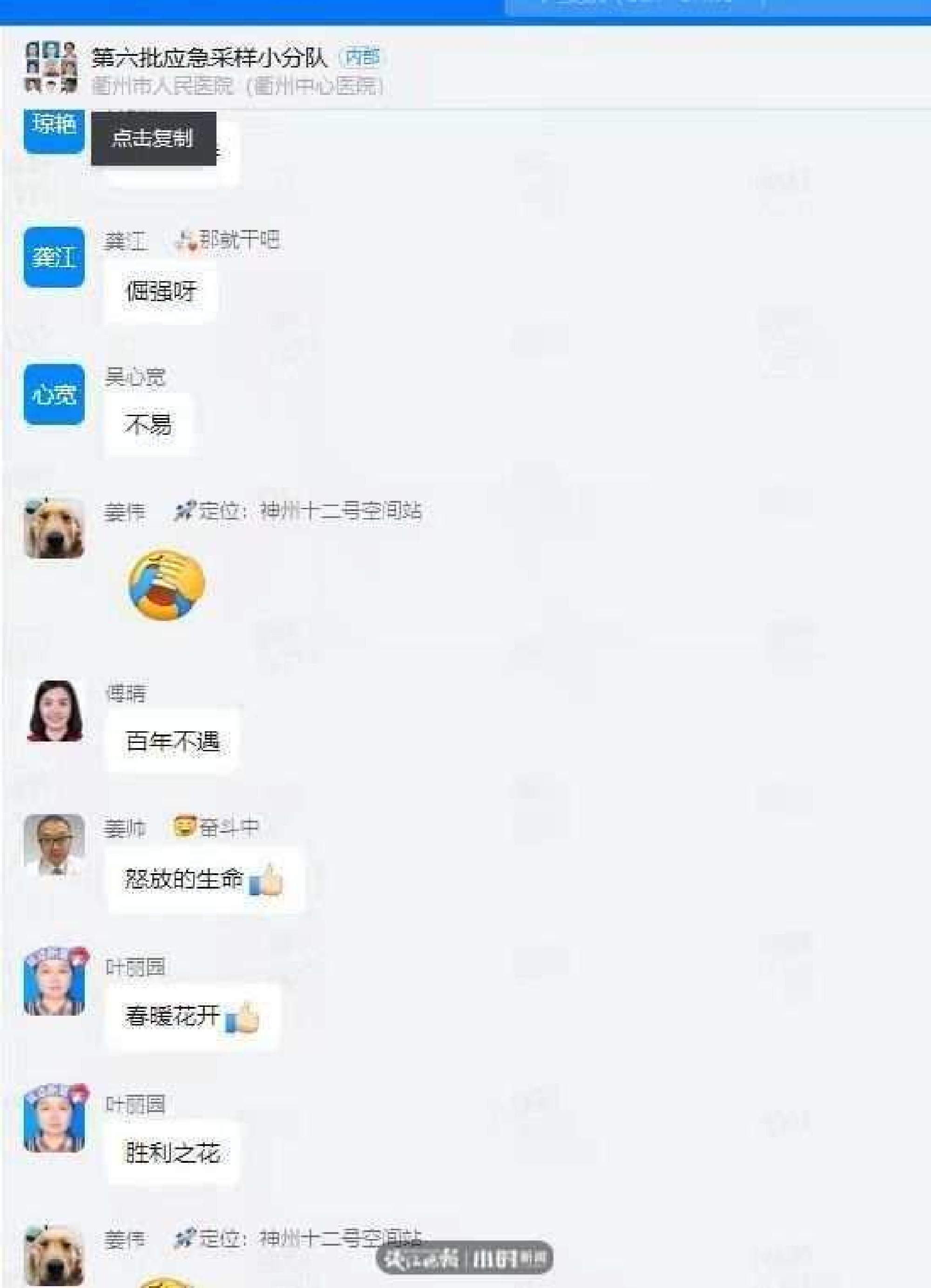 當(dāng)姜偉把這張自嘲的照片發(fā)到“衢州市人民醫(yī)院第六核酸采樣隊(duì)群”時(shí),群里的小伙伴炸開了鍋,一句句神點(diǎn)評(píng)撲面而來。