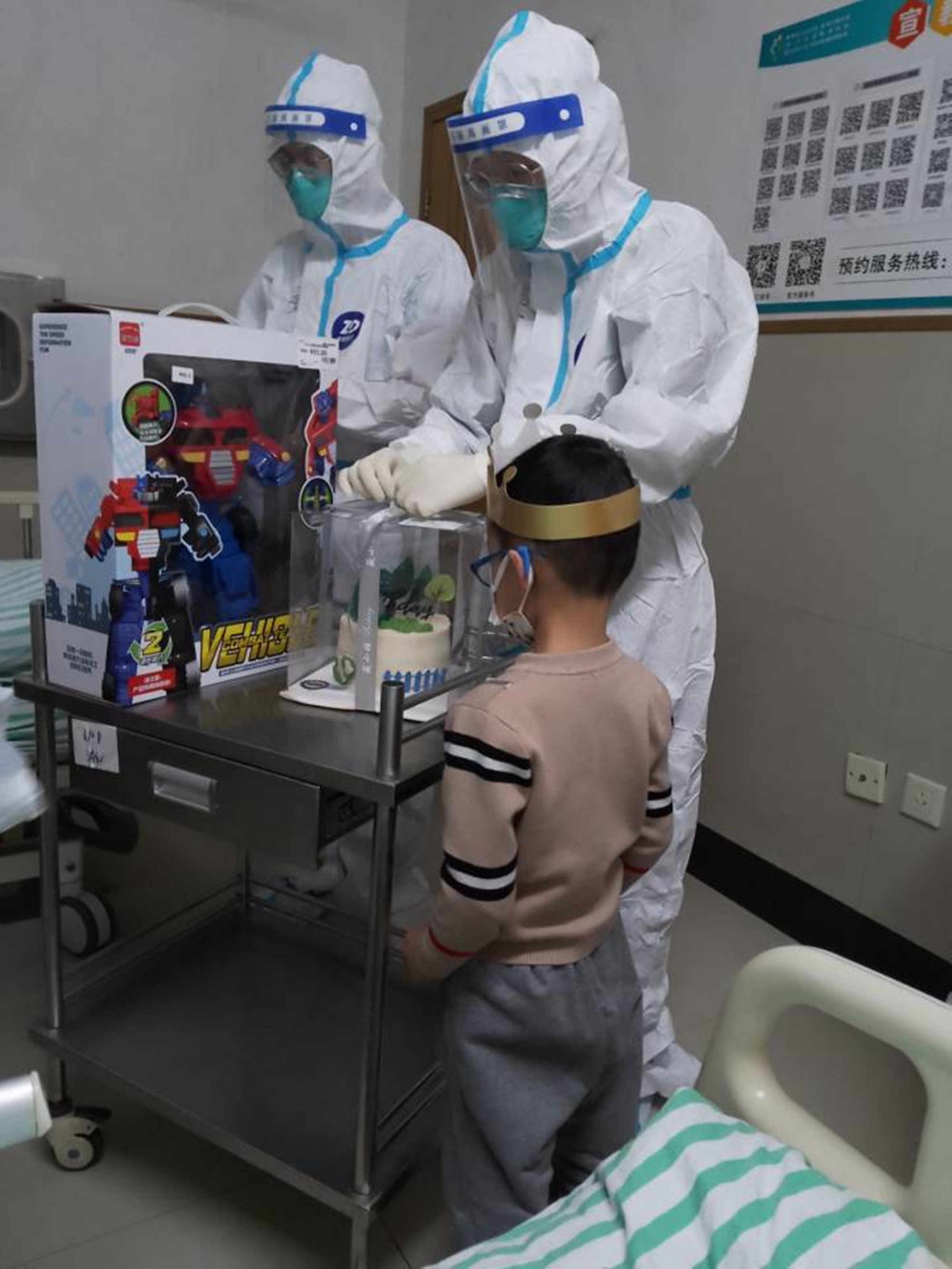 3月28日上午,在衢州市人民醫(yī)院隔離病房里,一場專門為小澤小朋友準(zhǔn)備的驚喜正悄悄降臨。當(dāng)生日蛋糕和玩具送到他的病床時(shí),小澤小朋友高興地跳了起來,用他那稚嫩的口吻說道:“謝謝阿姨,我太喜歡了!”