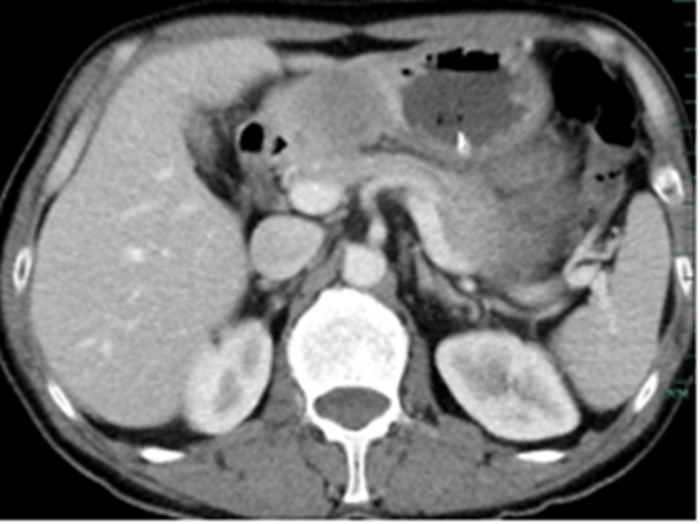 治療前的腹部CT提示胃