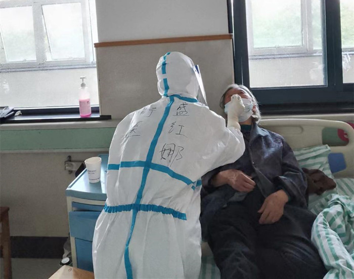 觀察患者病情,配合醫(yī)生治療,照顧患者的生活起居……是盛紅娜在隔離病房的主要護理工作。5月4日晚,盛紅娜正準備下班,當?shù)弥綦x病房內(nèi)一位89歲的老人疑似心梗,需要護理人員24小時特護時,“我來!”盛紅娜毫不猶豫“接班”,這一天,她持續(xù)工作了9個小時。