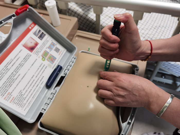“測(cè)試血糖時(shí)應(yīng)輪換采血部位,應(yīng)在手指?jìng)?cè)面采血,將采血針緊靠在手指?jìng)?cè)面,棄去第一滴血......”很快,姜先生康復(fù)出院了,出院時(shí)祝春燕細(xì)心地指導(dǎo)姜先生使用血糖儀。