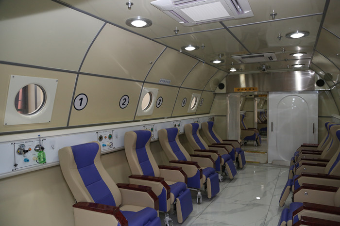 目前,我院高壓氧治療中心擁有浙西地區(qū)規(guī)模最大的艙群,艙體長 17.6 米,直徑3.2米,由兩個10座治療艙和一個過渡艙組成,空間寬敞舒適。輪椅、平床可以輕松進(jìn)入。氧艙采用先進(jìn)的微阻力緩沖式供排氧技術(shù),每個艙室裝有2個攝像頭,可全方位觀察艙內(nèi)病人動態(tài)變化,艙內(nèi)每個座位設(shè)有一級無阻力供氧和負(fù)壓吸痰裝置。