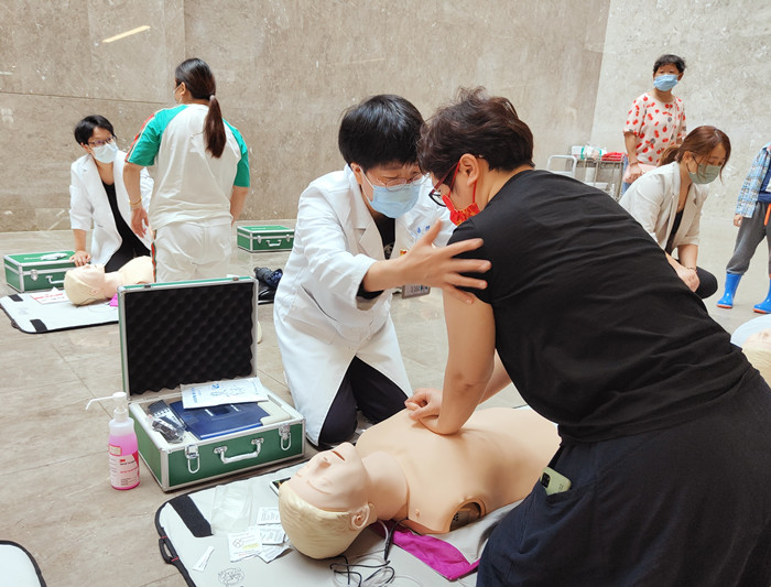 “選擇兩乳頭連線中點為按壓部位,一手掌跟緊貼該部位,十指交叉上翹,雙臂伸直用上身力量垂直向下按壓......”活動現(xiàn)場,我院門診部主任邵微穎向廣大市民現(xiàn)場演示心肺復蘇和自動體外除顫器(AED)的具體操作方法,對動作要領、按壓部位、人工呼吸等技巧進行講解。