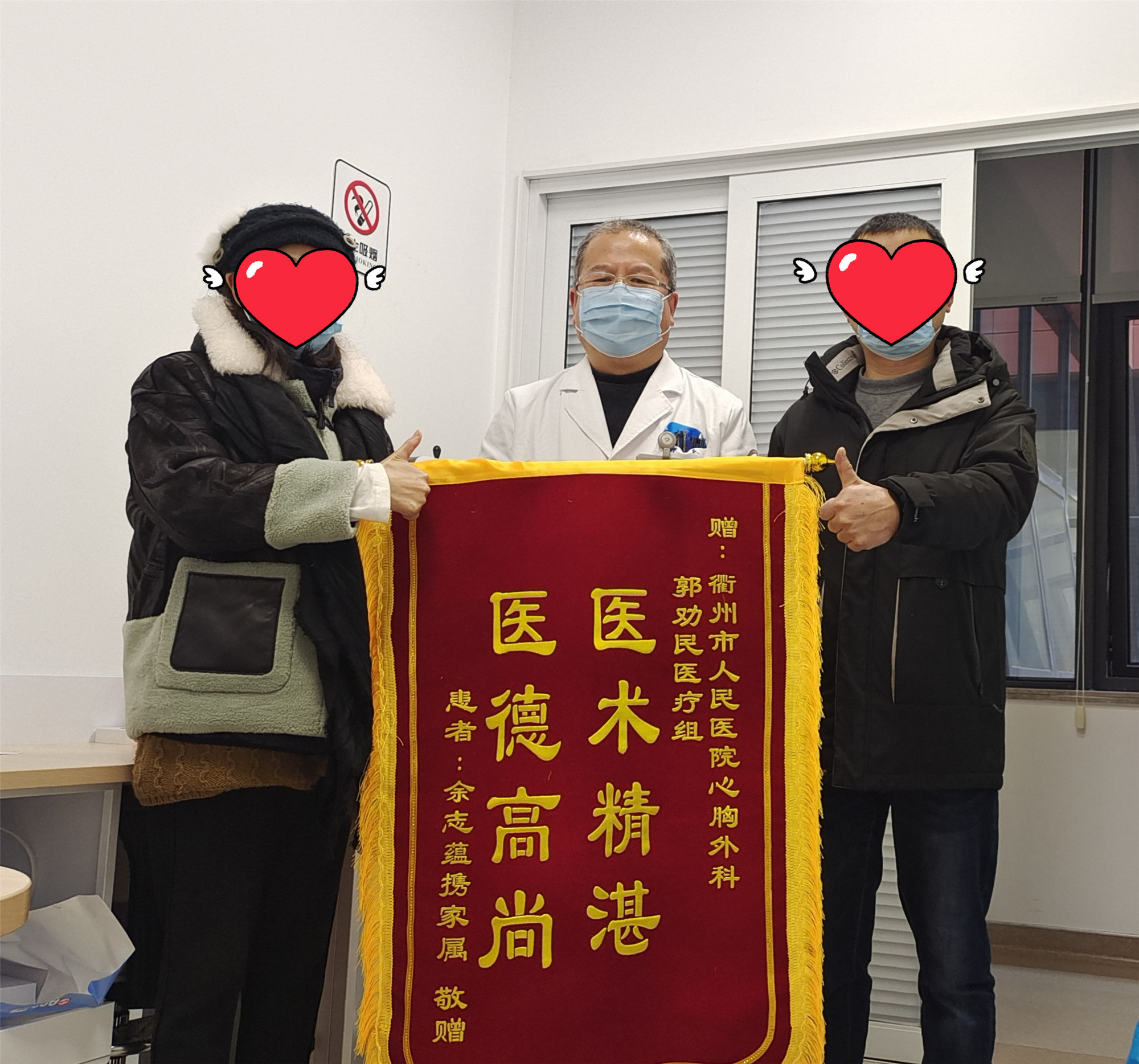 日前,家住柯城區(qū)的余女士將印有“醫(yī)術(shù)精湛,醫(yī)德高尚”和“全心全意,潤如春風(fēng)”的錦旗送到我院心胸外科郭勸民主任醫(yī)師和鄭紅護(hù)士長手中。