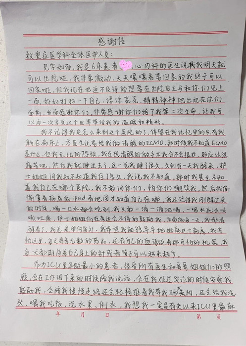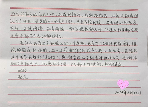 感謝信中,婷婷言辭懇切,她說,自己在ICU度過了最難忘的一個春節(jié),是ICU的白衣天使讓她感受到了溫暖。