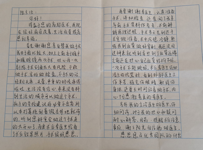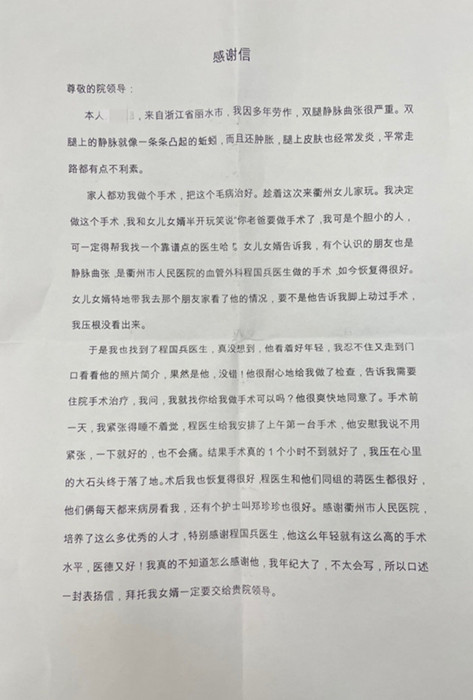 在血管外科醫(yī)護的精心治療下,鄭先生于術(shù)后第三天出院。為了感謝我院程國兵醫(yī)生及血管外科醫(yī)護團隊,鄭先生口述感激之情,讓女婿把感謝信送到醫(yī)院。