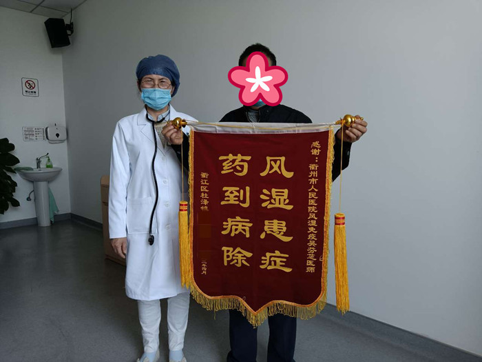 無獨有偶,來自衢江區(qū)的王先生患類風(fēng)濕關(guān)節(jié)炎多年,經(jīng)我院血液科+風(fēng)濕免疫科吳芬芝醫(yī)生的精心治療,取得良好的效果。日前,王先生特地將一面“風(fēng)濕患癥 藥到病除”的錦旗送到吳芬芝醫(yī)生的診室。
