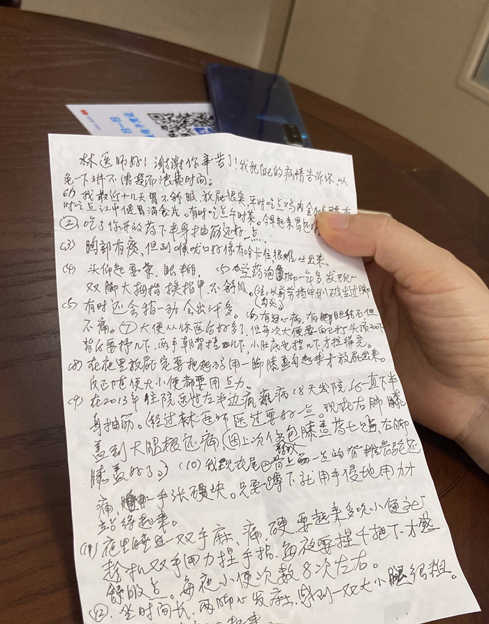 “怕一時說不清,耽誤林醫(yī)生的時間,我就提前將病情寫在紙上?!敝炷棠叹驮\前做足了“功課”,她把自己的病情,和經(jīng)過林醫(yī)生診治后好轉(zhuǎn)的情況一一標注。