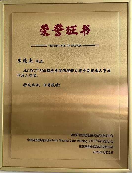 2、李曉杰在全國創(chuàng)傷視頻大賽獲獎