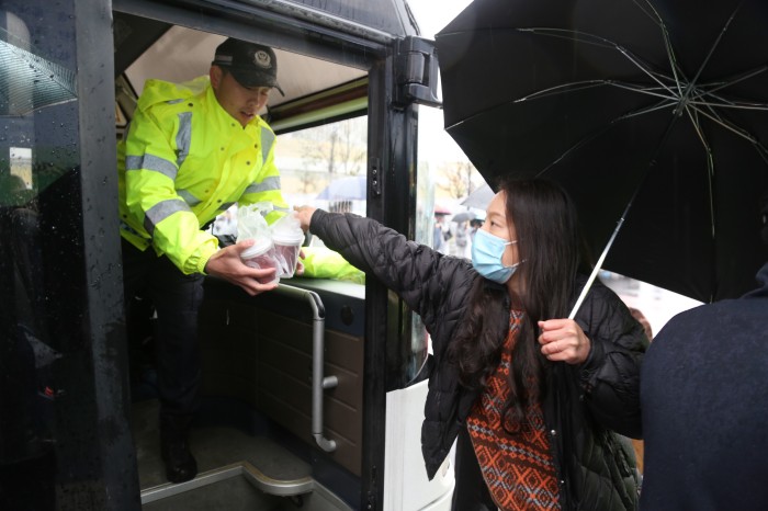 下午3點(diǎn),志愿者們集結(jié)后,為在體育館周邊及現(xiàn)場(chǎng)維持秩序的交警、安保人員以及環(huán)衛(wèi)工人們,免費(fèi)派發(fā)共計(jì)500余杯“愛(ài)心姜茶”。