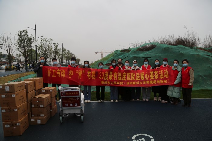 “辛苦了!”“喝杯姜茶暖暖身子!”來(lái)自衢州市人民醫(yī)院(溫州醫(yī)科大學(xué)附屬衢州醫(yī)院)的志愿者們推著愛(ài)心行李車(chē),將一份份熱乎乎的姜茶送到工作人員手中。