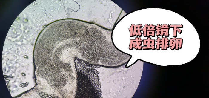 三天后,寶媽將透明膠帶送至檢驗科。在透明膠帶上肉眼可見一條長約1CM的細(xì)小乳白色線蟲。通過低倍顯微鏡查看,清晰地看到成蟲體內(nèi)及周邊密密麻麻,橢圓形的透明蟲卵,此時還在不遺余力的排泄蟲卵。
