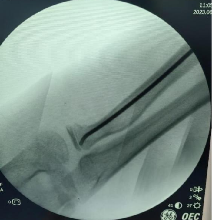 錢(qián)鈞組織骨科團(tuán)隊(duì)研討手術(shù)方案,決定為毅毅實(shí)施“橈骨頸骨折閉合復(fù)位彈性髓內(nèi)針內(nèi)固定術(shù)”。
