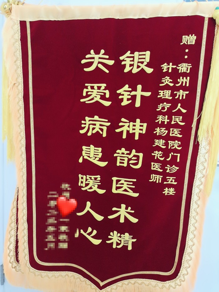 近日,來自杭州的李女士將一面寫著“銀針神韻醫(yī)術(shù)精,關(guān)愛病患暖人心”的錦旗寄送到我院針灸理療科,感謝楊建花副主任中醫(yī)師。