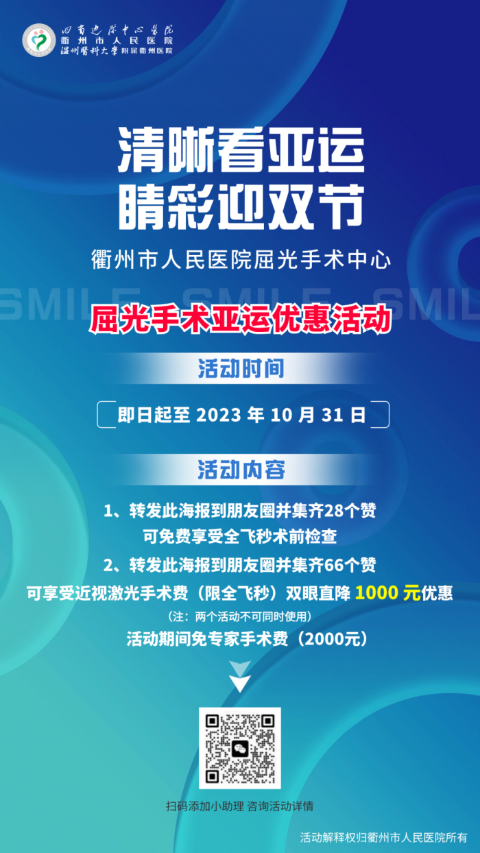 衢州市人民醫(yī)院(溫州醫(yī)科大學附屬衢州醫(yī)院)屈光手術中心針對全飛秒手術,特別推出“清晰看亞運,'睛'彩迎雙節(jié)”優(yōu)惠活動,助力全民眼健康。