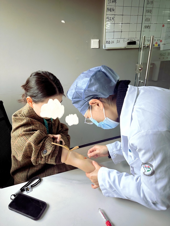 消化內(nèi)科護(hù)士周敏慧接單后,前往鄭女士的工作地點(diǎn)為其現(xiàn)場采血,憑借熟練的操作手法、熱情的服務(wù)態(tài)度,周敏慧很快為鄭女士完成采血,并講解采血后注意事項(xiàng),得到鄭女士稱贊。