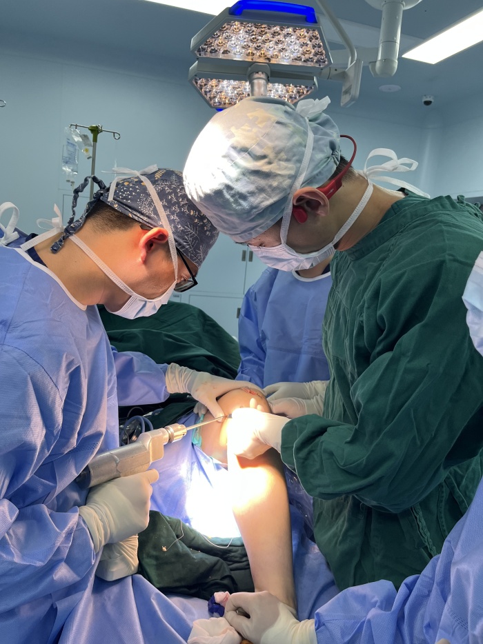 術中關節(jié)鏡檢查發(fā)現,小羅的髕骨外推容易出現脫出,內側韌帶明顯松弛。于是,通過1cm切口微創(chuàng)取出肌腱,術中透視精準定位韌帶隧道,雙束重建韌帶,最大化模擬內側髕股韌帶結構。
