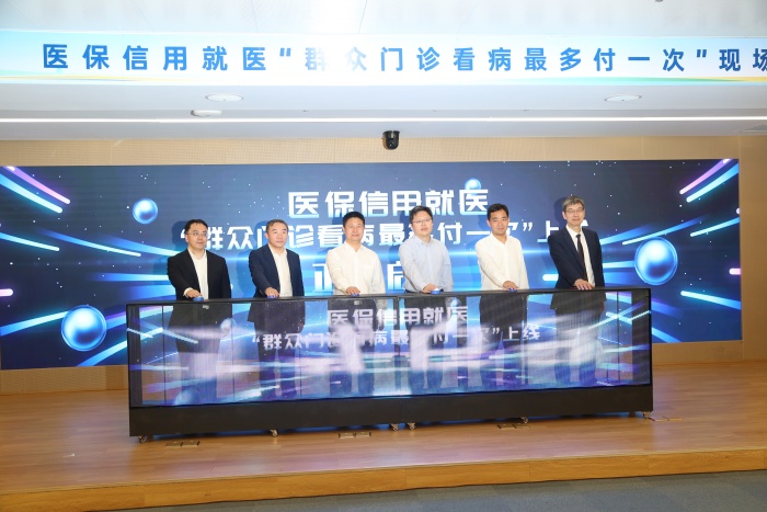 活動(dòng)現(xiàn)場,黃華波、蔣成嘉、曹岑、楊圓華、王繼明、陳成水共同啟動(dòng)醫(yī)保信用就醫(yī)“群眾門診看病最多付一次”上線。