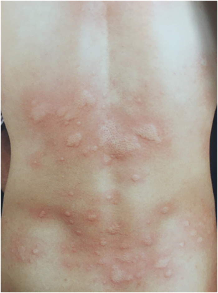 皮膚疹子:通常為紅色、隆起的疹子或斑塊,可能會(huì)在皮膚上呈現(xiàn)不規(guī)則形狀,大小不一。