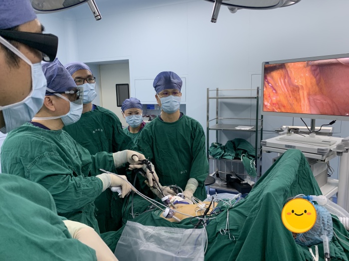 在手術(shù)中,紀偉平通過腹壁上的微小切口,將腹腔鏡及手術(shù)器械精準地放入腹腔,借助高清的3D影像,清晰地觀察到腹腔內(nèi)的解剖結(jié)構(gòu),精準地判斷病灶的位置和大小。