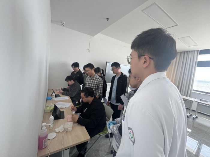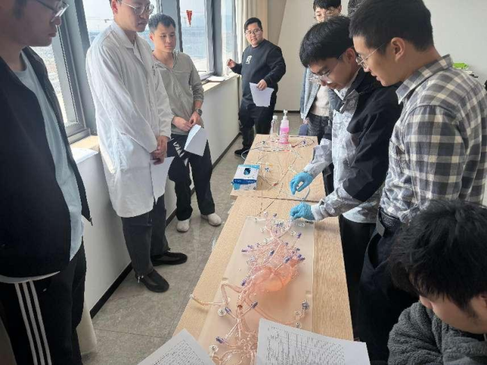 此次活動緊扣實戰(zhàn)需求,由血管外科主治醫(yī)師胡強全程指導(dǎo),十余名住院醫(yī)師規(guī)范化培訓(xùn)學(xué)員參與,內(nèi)容涵蓋超聲引導(dǎo)下血管穿刺術(shù)、下腔靜脈濾器植入/取出術(shù)及高仿真血管手術(shù)模擬器實操等三大模塊,采用“理論授課—模擬操作—案例復(fù)盤”的閉環(huán)教學(xué)模式。