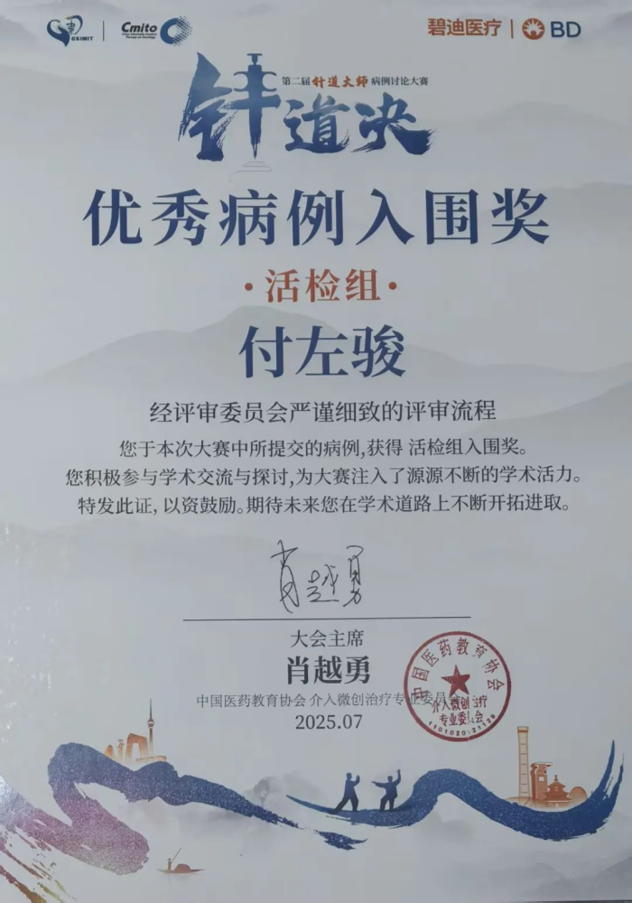 經(jīng)過層層選拔,國內(nèi)僅62個優(yōu)質(zhì)病例獲得參賽資格,11名精英選手晉級超聲介入活檢組全國總決賽。面對“超聲多模態(tài)靈活運用引導盆腔腫塊精準活檢——經(jīng)直腸超聲陰道腫塊穿刺活檢”這一高難度穿刺活檢,付左駿靈活運用超聲多模態(tài)技術(多探頭協(xié)同),精準定位病灶,規(guī)劃最優(yōu)路徑,全程精準制導,贏得評委的高度肯定,榮獲“優(yōu)秀病例入圍獎”。