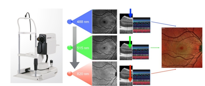 ??? 德國海德堡炫彩(Multicolor)激光眼底成像技術是一種全新的眼底影像模式,它采用三束不同波長的激光同時掃描眼底,由于各波長激光的組織穿透力不同,可以分別針對不同層次的眼底組織進行清晰觀察。