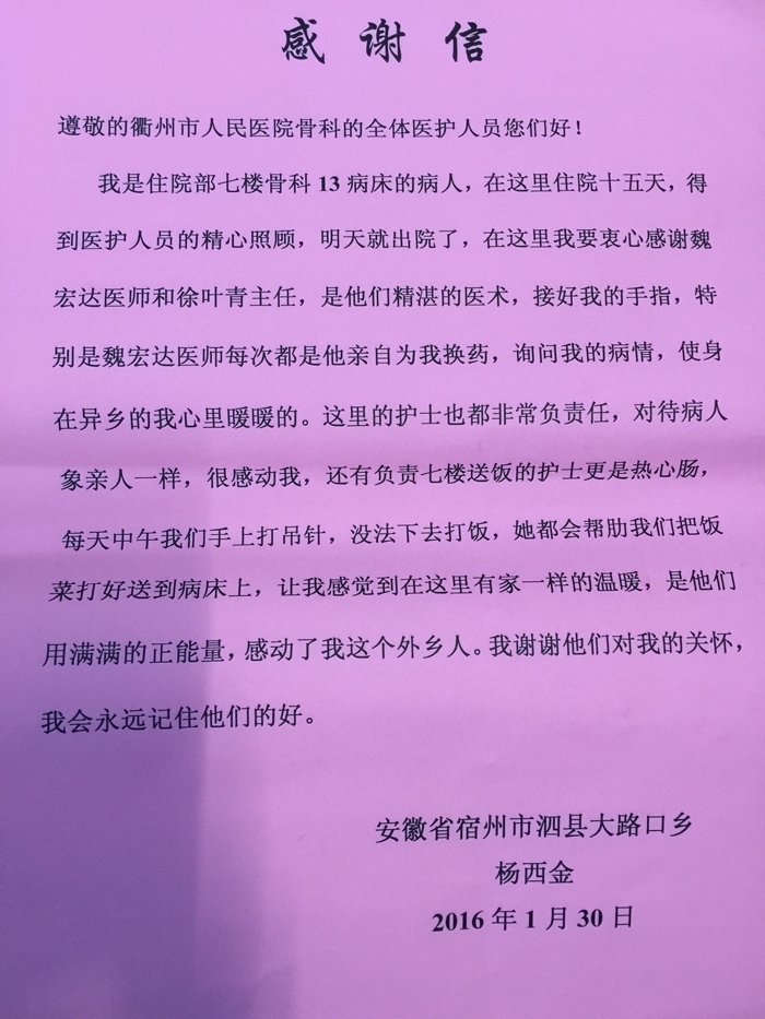 ??? 近日,骨科七病區(qū)病房里收到一封來自外鄉(xiāng)患者的感謝信,據(jù)悉,該患者是骨科七病區(qū)13床的病人,因左手中指骨折在我院骨科接受治療,住院15天,得到了醫(yī)務(wù)人員的精心照顧。醫(yī)生和護士的真誠態(tài)度,讓他感覺到這里有家一樣的溫暖,為感謝骨科醫(yī)生、護士及醫(yī)院營養(yǎng)科的周到服務(wù),特此寫了一封感謝信表達謝意。