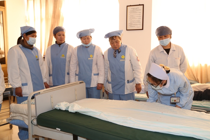 ??? 本次培訓主要內(nèi)容包括院感相關(guān)知識,鋪床、更換床單位、口腔護理、皮膚護理、頭發(fā)護理操作流程、病人轉(zhuǎn)運規(guī)范。分別由急診、內(nèi)科、外科護士長主講,并現(xiàn)場進行操作演示,每位健康助理員逐一逐項練習。