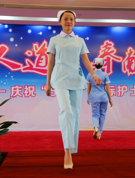 ??? 活動現場,20套新版護士服在T臺上進行了展示,導診服、孕婦服、分體裝、冬裝;淡藍、淺綠、嫩粉、小碎花……表現了最現代、清新、簡約、端莊、靚麗的護士形象,精彩節(jié)目充分展示了白衣天使們剛柔并濟、多才多藝的一面。