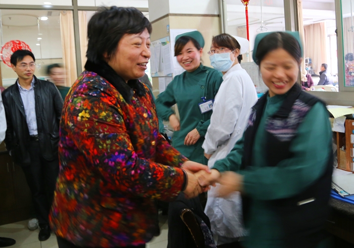 ??? 馬梅芝一行來到急診科、呼吸內(nèi)科等科室,與醫(yī)護(hù)人員親切握手,她說過年了大家還在緊張、忙碌、有序的工作,非常辛苦,并叮囑現(xiàn)在流感疫情越來越嚴(yán)重,醫(yī)護(hù)人員要做好防護(hù)措施,保護(hù)好自己,最后祝醫(yī)護(hù)人員新春快樂!