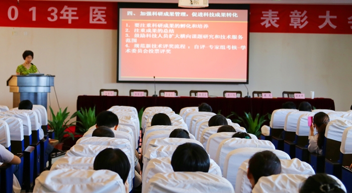 ??? 7月2日下午,我院2013年科技工作總結(jié)表彰大會(huì)在五樓學(xué)術(shù)報(bào)告廳召開(kāi)。院領(lǐng)導(dǎo)班子、班組長(zhǎng)以上干部、三級(jí)醫(yī)師、住院醫(yī)師規(guī)范化培訓(xùn)學(xué)員、獲獎(jiǎng)人員及研究生代表等參加了會(huì)議,院黨委副書(shū)記蔣一鳴主持會(huì)議。