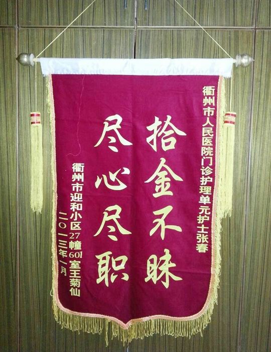 ??? 1月22日上午,柯城區(qū)的王女士給我院送來一面錦旗,她說要感謝門診護(hù)理單元的張春護(hù)士。