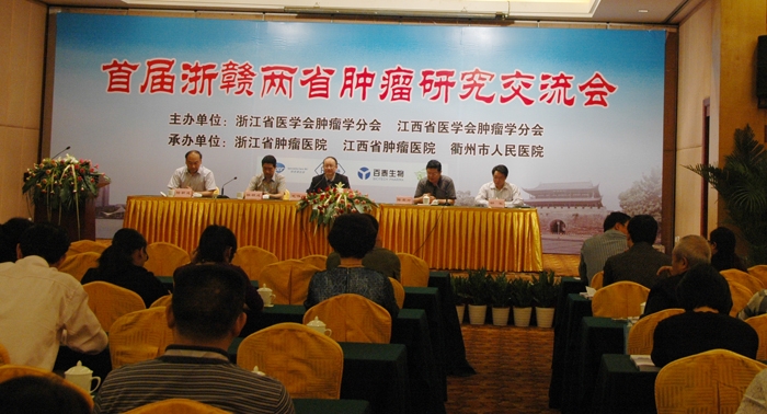 ????由浙江省和江西省醫(yī)學(xué)會腫瘤學(xué)分會主辦,浙江省和江西省腫瘤醫(yī)院、衢州市人民醫(yī)院承辦的首屆浙贛兩省腫瘤高峰論壇及學(xué)術(shù)交流會于9月27日一29日在衢州飯店隆重召開。浙贛兩省醫(yī)學(xué)會、腫瘤醫(yī)院的領(lǐng)導(dǎo)及我市衛(wèi)生局陳根成局長、我院陳震宏院長等領(lǐng)導(dǎo)、專家參加了開幕式并致辭。來自海外、中科院的學(xué)者及兩省腫瘤學(xué)專家150余人參加本次會議。