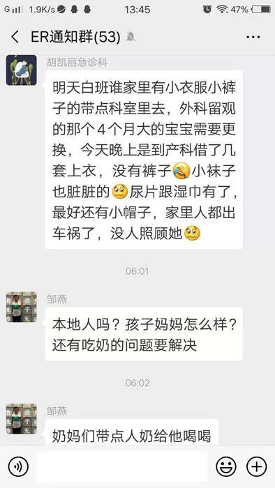 醫(yī)院里有不少護士也都有小孩,女嬰的遭遇讓科室里的媽媽們坐不住了。正在哺乳期的護士劉虹和楊冰倩輪流給女嬰喂奶。工作間隙,護士鄒燕和林佳麗輪流給女嬰喂奶粉,其他科室的護士聽說女嬰的遭遇也匆匆趕到急診科照料女嬰。