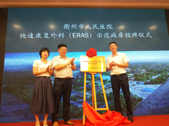 在開幕式上,浙江大學醫(yī)學院附屬邵逸夫醫(yī)院梁霄教授對市人民醫(yī)院進行了加速康復外科(ERAS)示范分中心授牌。