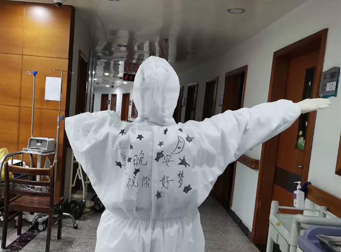 2月21日,結(jié)束了一天的護(hù)理工作后,她又在防護(hù)服背后畫畫報(bào)平安,“我愛(ài)星爸爸”“晚安,祝你好夢(mèng)”“大白書(shū)光”……一句句詼諧的話語(yǔ)看似調(diào)侃實(shí)則溫情滿滿,你能猜出哪一個(gè)才是調(diào)皮的她嗎?